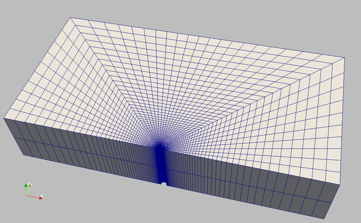 Let us take a closer look at the geometry of this wellbore problem. We use the internal wellbore mesh generator InternalWellbore to create a rock domain (10\, m \, \times 5 \,  m \, \times 2 \, m), with a wellbore of initial radius equal to 0.1 m. Only half of the domain is modeled by a theta angle from 0 to 180, assuming symmetry for the rest of the domain. Coordinates of trajectory defines the wellbore trajectory, a vertical well in this example. By turning on autoSpaceRadialElems="{ 1 }", the internal mesh generator automatically sets number and spacing of elements in the radial direction, which overrides the values of nr. With useCartesianOuterBoundary="0", a Cartesian aligned boundary condition is enforced on the outer blocks. This way, a structured three-dimensional mesh is created with 50 x 40 x 2 elements in the radial, tangential and z directions, respectively. All elements are eight-node hexahedral elements (C3D8) and refinement is performed to conform with the wellbore geometry. This mesh is defined as a cell block with the name cb1.