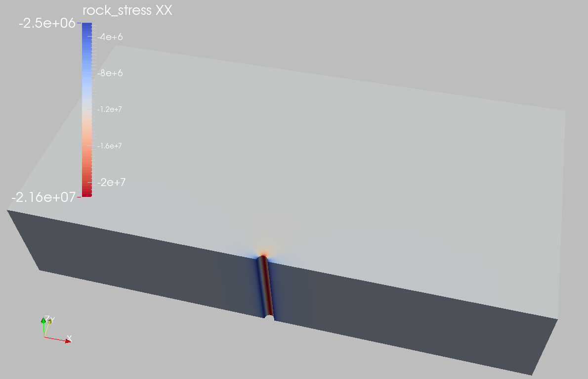In the above examples, we request VTK output files that can be imported into Paraview to visualize the outcome. The following figure shows the distribution of \sigma_{xx} in the near wellbore region.
