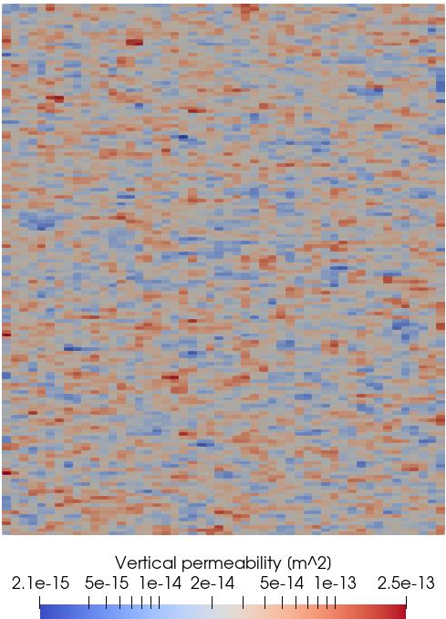 The heterogeneous values of the permeability field can also be visualized in Paraview as shown below: