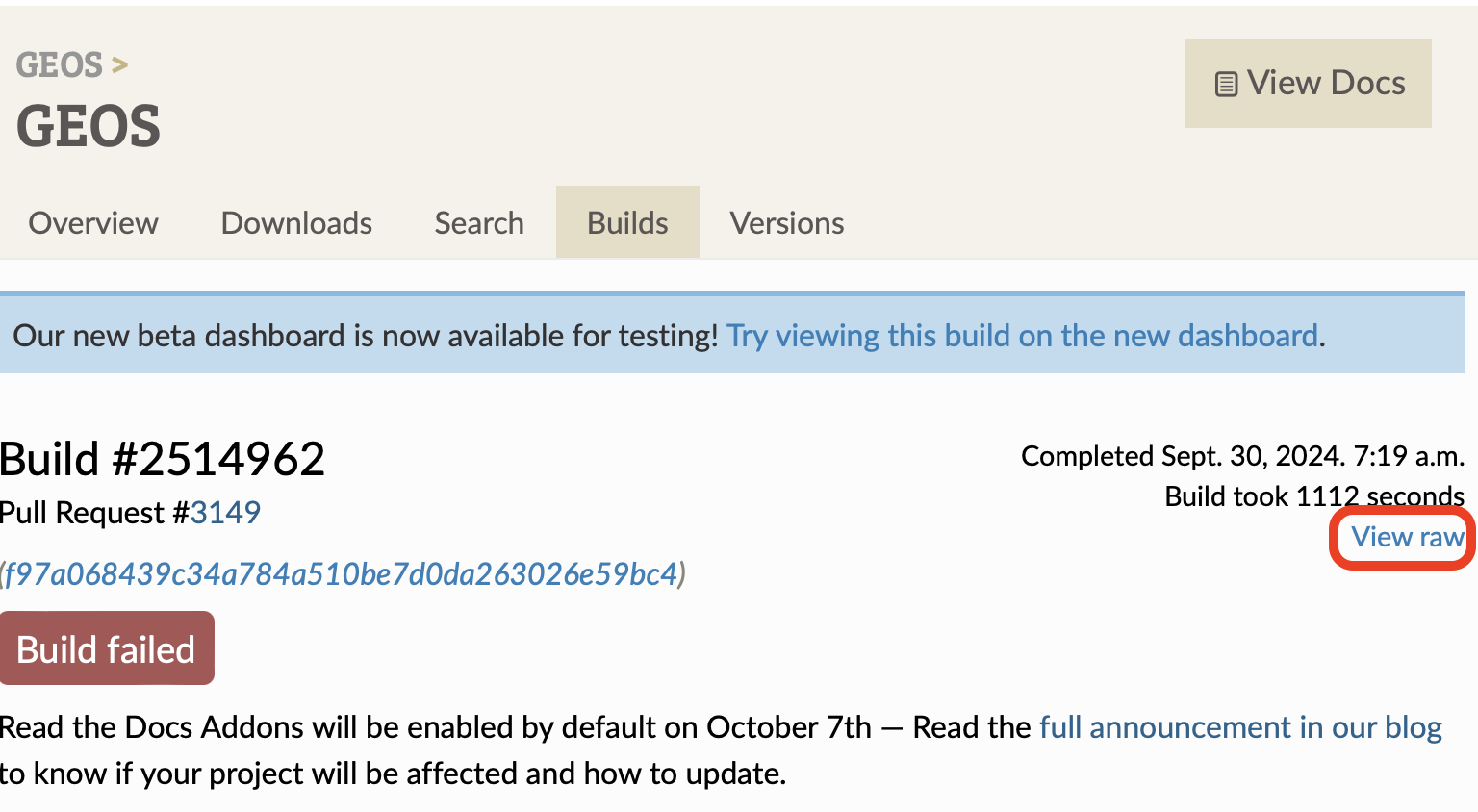 1. Download the logs from the failed test on readthedocs through the “view raw” button.